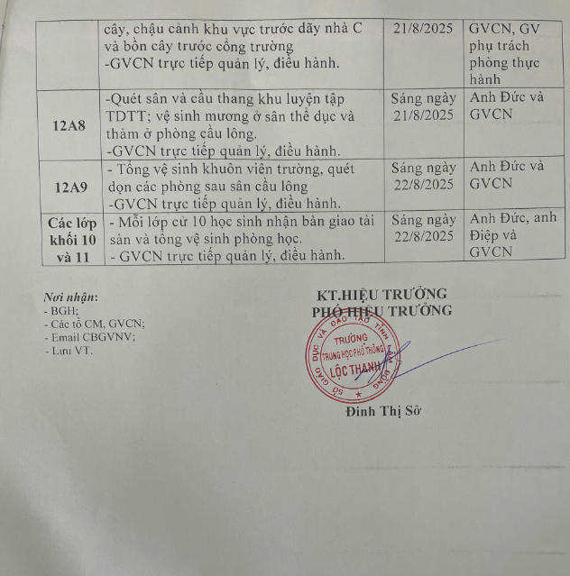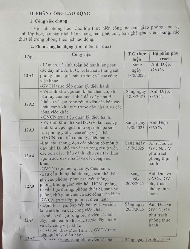 Kế hoạch bàn giao CSVC , lao động vệ sinh chuẩn bị Tựu trường năm học 2025-2026.