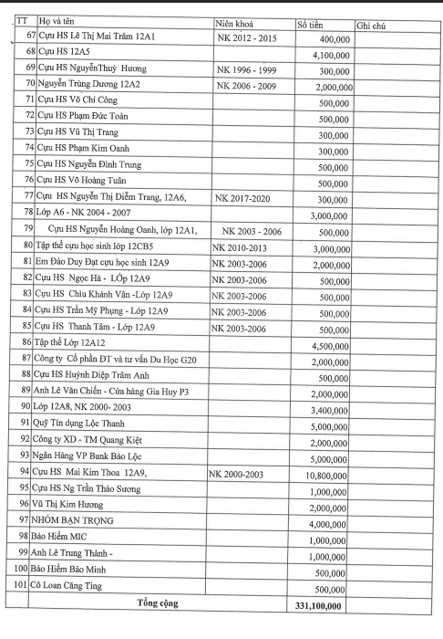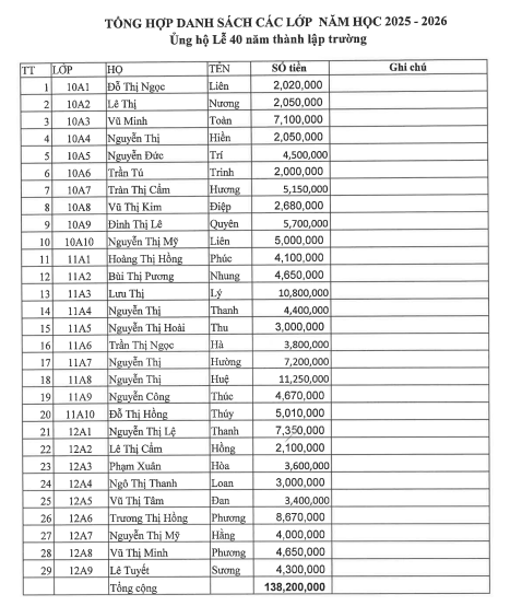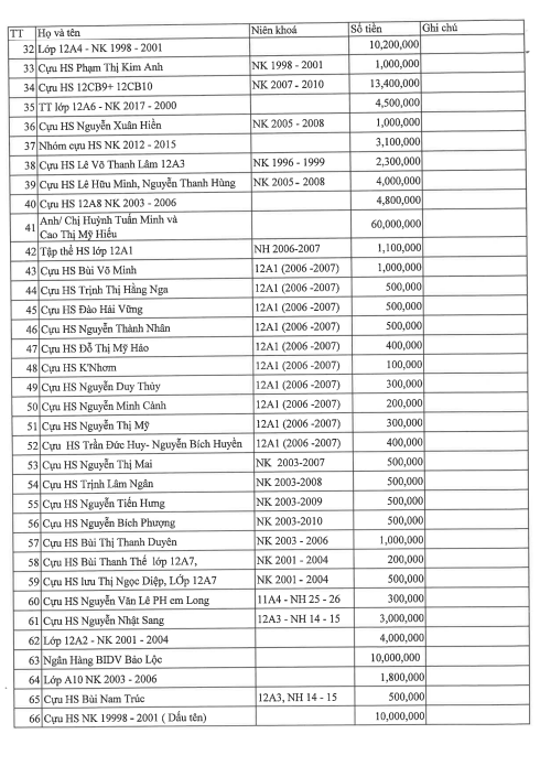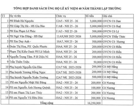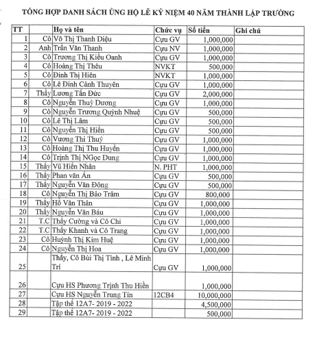 Danh sách ủng hộ lễ kỷ niệm 40 năm thành lập trường