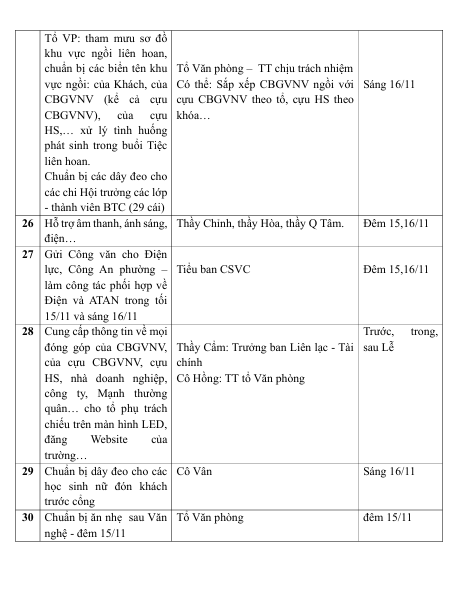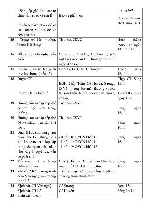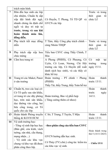 PHÂN CÔNG NHIỆM VỤ CỤ THỂ LỄ KỈ NIỆM 40 NĂM NGÀY THÀNH LẬP TRƯỜNG (16/11/2025)